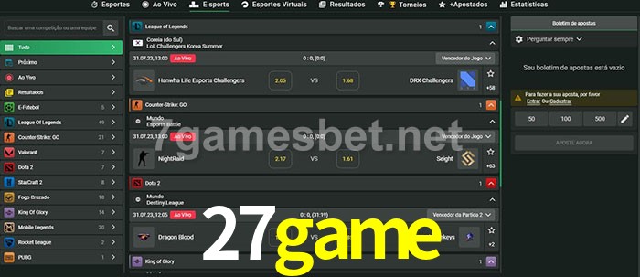 O 27game oferece uma grande seleção de opções de apostas em e-sports com probabilidades competitivas